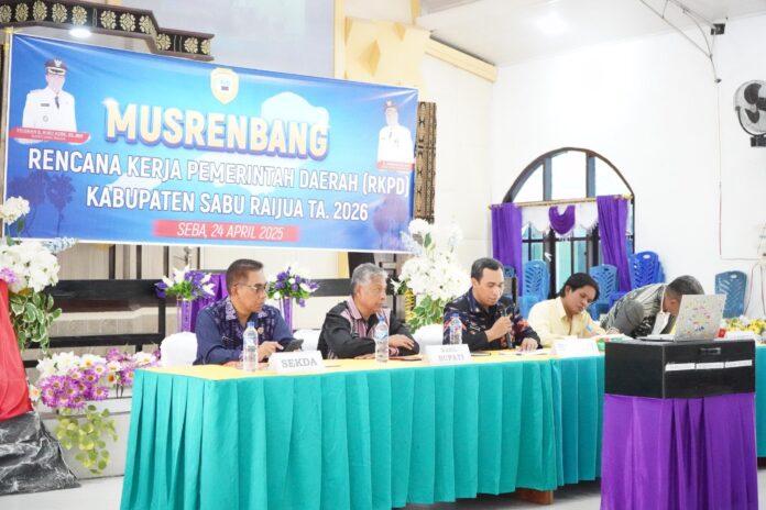 Seba, FKKNews.com – Pemerintah Kabupaten Sabu Raijua menggelar kegiatan Musyawarah Perencanaan Pembangunan (Musrenbang) Rencana Kerja Pemerintah Daerah (RKPD) Tahun Anggaran 2026 yang berlangsung di Gedung Gereja Yeruel, Seba Kota. Kegiatan ini secara resmi dibuka oleh Bupati Sabu Raijua, Krisman B. Riwu Kore, SE., MM, dan dihadiri oleh berbagai unsur pimpinan daerah, tokoh masyarakat, dan pemangku kepentingan lainnya, Kamis (24/4/2025).