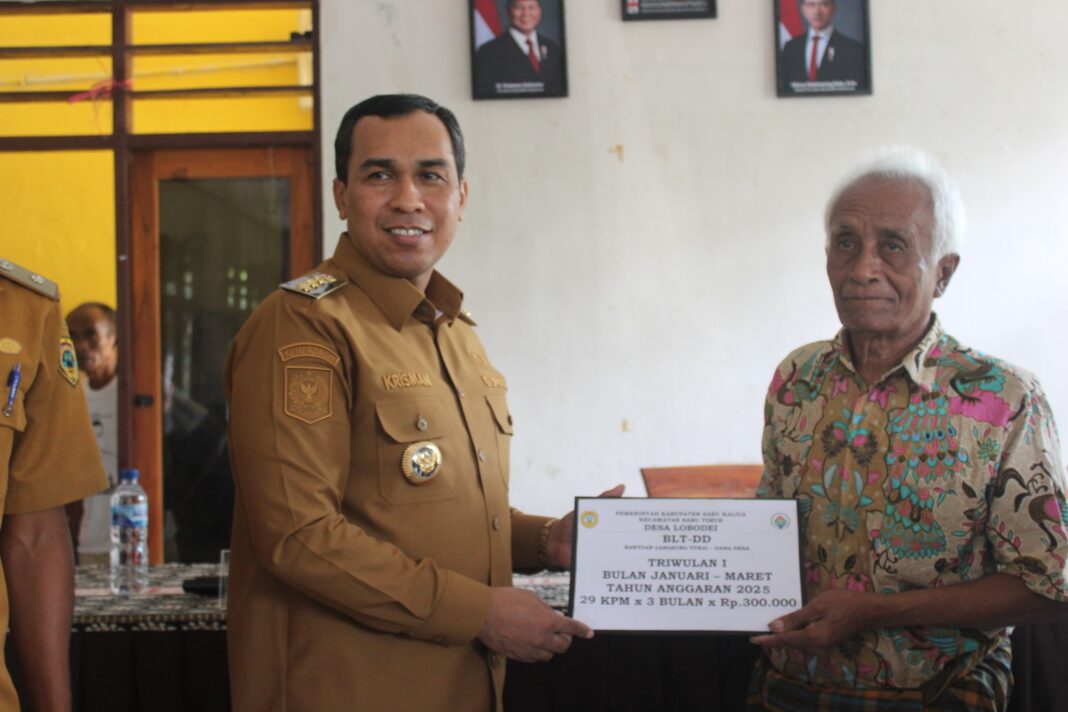 Menia, FKKNews.com – Bupati Sabu Raijua, Krisman B. Riwu Kore, SE., MM, menyerahkan secara simbolis Bantuan Langsung Tunai Dana Desa (BLT DD) Triwulan I Tahun 2025 kepada masyarakat Desa Lobodei, Kecamatan Sabu Timur. Kegiatan tersebut berlangsung di Kantor Desa Lobodei, dan dihadiri oleh Camat Sabu Timur, Pj Kepala Desa Lobodei, Pendamping Desa, serta 29 warga penerima manfaat BLT, Senin (26/5/2025).