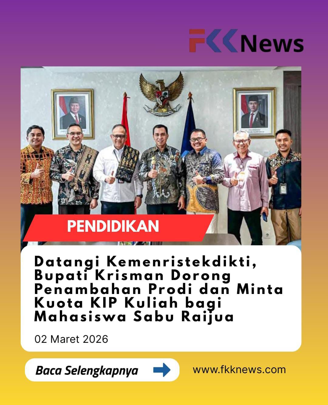 Jakarta, FKKNews.com – Bupati Sabu Raijua, Krisman B. Riwu Kore, mendatangi Kementerian Riset, Teknologi, dan Pendidikan Tinggi Republik Indonesia (Kemenristekdikti) guna mendorong peningkatan akses dan kualitas pendidikan tinggi bagi mahasiswa asal Sabu Raijua.