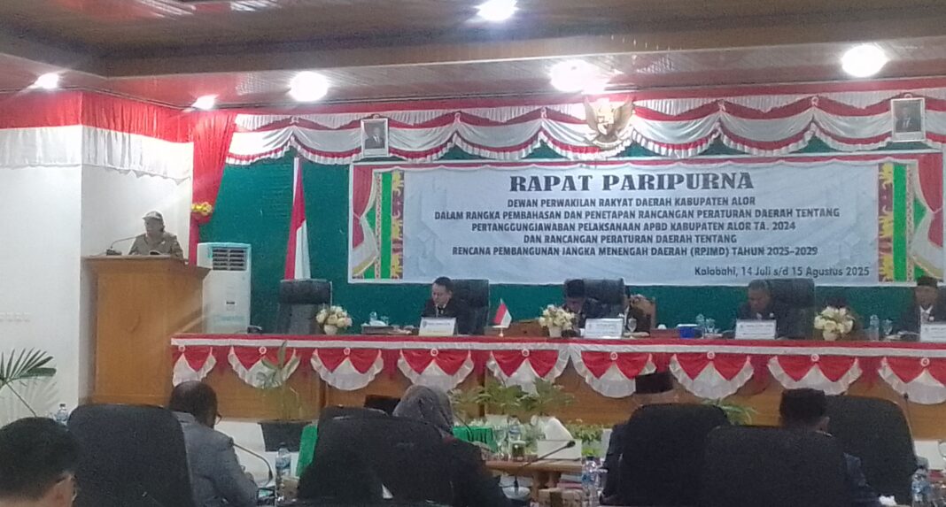Kalabahi, FkkNews.com – Dewan Perwakilan Rakyat Daerah Kabupaten Alor menggelar Rapat Paripurna dalam Rangka Pembahasan dan Penetapan Rancangan Peraturan Daerah Tentang Pertanggungjawaban Pelaksanaan APBD Kabupaten Alor Tahun Anggaran 2024 Dan Rancangan Peraturan Daerah Tentang Rancangan Pembangunan Jangka Menengah Daerah (RPJMD) Tahun 2025-2029.
