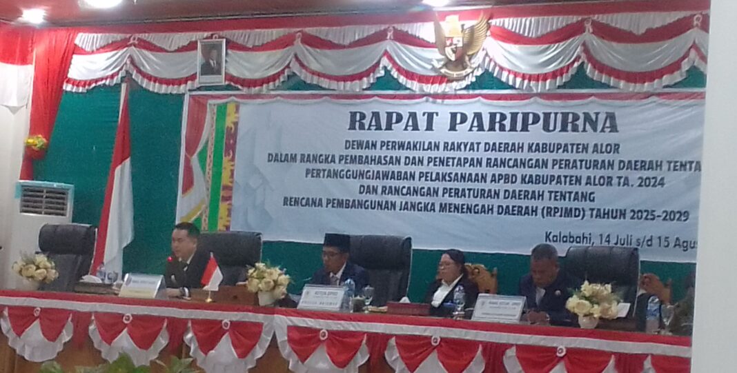 Kalabahi, FkkNews.com – Wakil Bupati Alor, Rocky Winaryo,S.H.,M.H, menghadiri Rapat Paripurna Dewan Perwakilan Rakyat Daerah (DPRD) Kabupaten Alor Dalam Rangka Pembahasan Dan Penetapan Rancangan Peraturan Daerah Tentang Pertanggung jawaban Pelaksanaan APBD Kabupaten Alor Tahun Anggaran 2024 Dan Rancangan Peraturan Daerah Tentang Rancangan Pembangunan Jangka Menengah Daerah (RPJMD) Tahun 2025-2029.