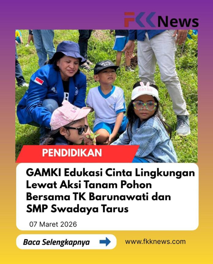 Oelamasi, FKKNews.com – Suasana ceria dan penuh semangat mewarnai lingkungan SMP Swadaya Tarus, Kabupaten Kupang, Jumat (6/3/2026). Puluhan anak dari TK Barunawati Kupang mengikuti kegiatan penanaman pohon yang dikemas dalam aksi edukasi lingkungan. Kegiatan ini merupakan hasil kolaborasi antara Dewan Pimpinan Daerah Gerakan Angkatan Muda Kristen Indonesia (DPD GAMKI) NTT, TK Barunawati Kupang, dan SMP Swadaya Tarus.