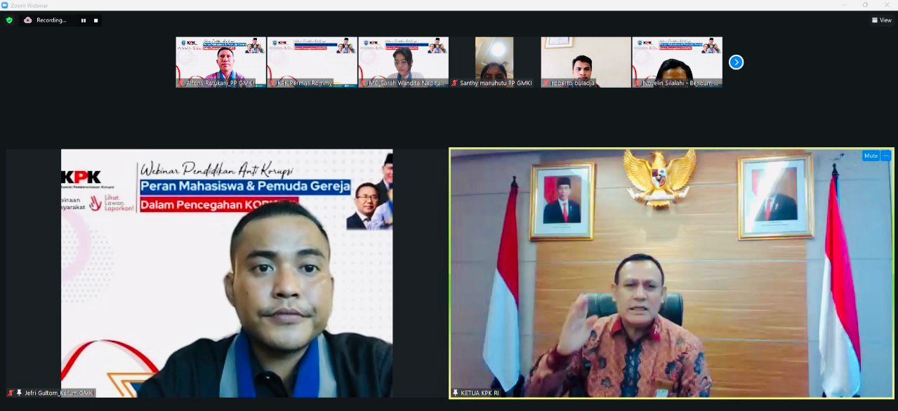 Jakarta, FKKNews.com – Gerakan Mahasiswa Kristen Indonesia (GMKI) melakukan webinar dengan tema “Peran Mahasiswa Dan Pemuda Gereja Dalam Memberantas Korupsi” dalam rangka edukasi untuk pencegahan korupsi pada mahasiswa, Kamis (21/04/2022) secara virtual.
