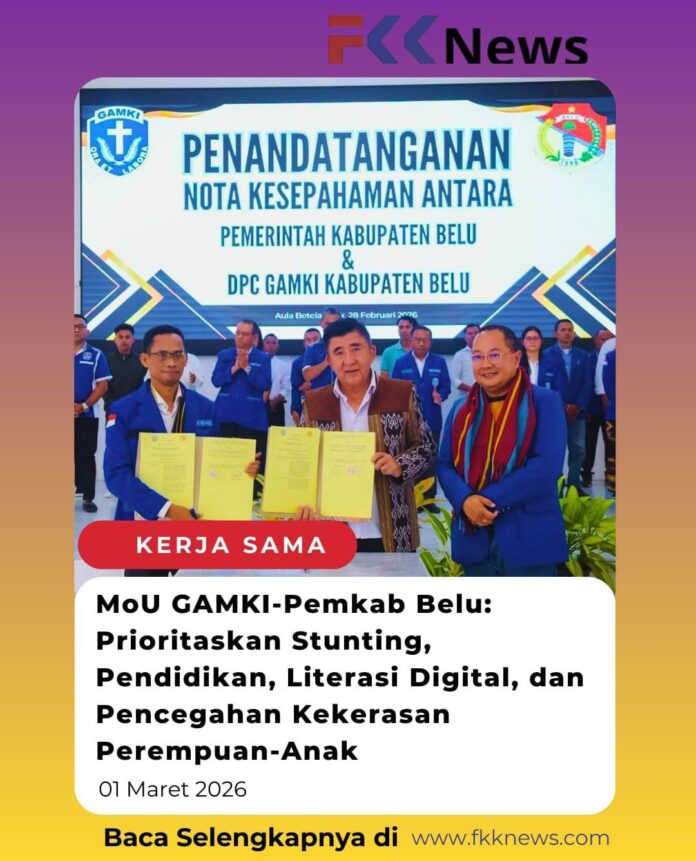 Atambua, FKKNews.com – Dewan Pimpinan Cabang (DPC) Gerakan Angkatan Muda Kristen Indonesia (GAMKI) Kabupaten Belu dan Pemerintah Kabupaten Belu resmi menandatangani Nota Kesepahaman (MoU) yang memprioritaskan penurunan stunting, penguatan pendidikan, literasi digital, serta pencegahan kekerasan terhadap perempuan dan anak, Sabtu (28/02/2026) di Gedung Wanita Betelalenok, Atambua.