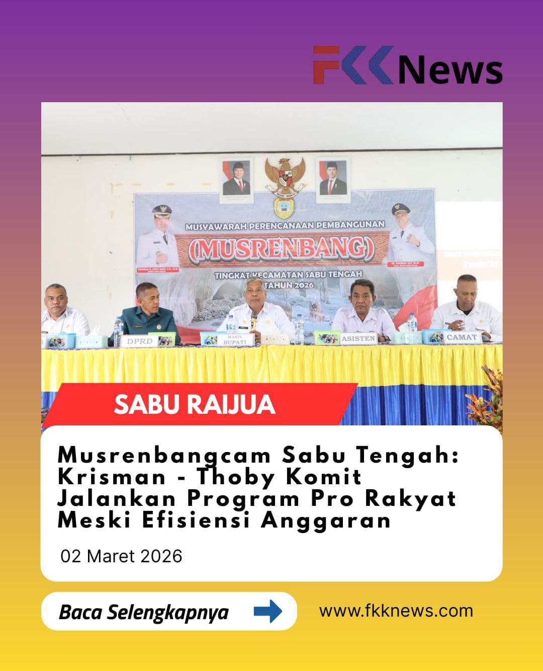 Seba, FKKNews.com – Wakil Bupati Sabu Raijua, Thobias Uly, menghadiri dan membuka secara resmi Musyawarah Perencanaan Pembangunan Tingkat Kecamatan (Musrenbangcam) Sabu Tengah yang digelar di Aula Kantor Camat, Rabu (25/02/2026).