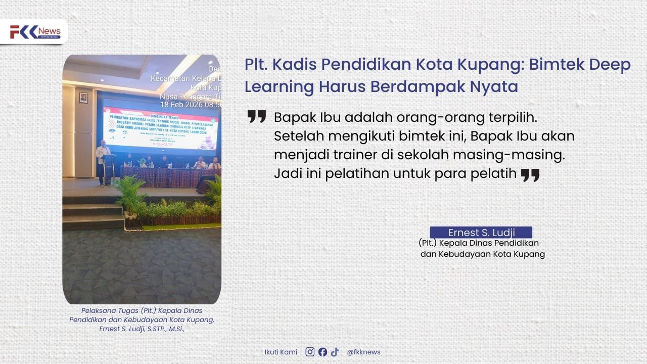 Kupang, FKKNews com – Pelaksana Tugas (Plt.) Kepala Dinas Pendidikan dan Kebudayaan Kota Kupang, Ernest S. Ludji, S.STP., M.Si., menegaskan bahwa Bimbingan Teknis (Bimtek) Penguatan Kapasitas Guru tentang Model-Model Pembelajaran Inovatif Berbasis Deep Learning bagi guru jenjang SMP/MTs se-Kota Kupang harus memberi dampak nyata bagi sekolah.