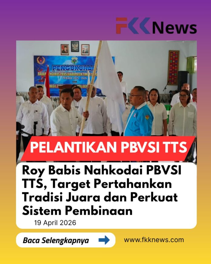 Soe, FKKNews.com – Kepemimpinan baru bola voli Timor Tengah Selatan (TTS) resmi dimulai. Roy Babis dikukuhkan sebagai Ketua Pengurus Kabupaten (Pengkab) PBVSI TTS masa bakti 2025–2029 dalam seremoni yang berlangsung di Aula SMK Negeri 2 TTS, Sabtu (18/4/2026).