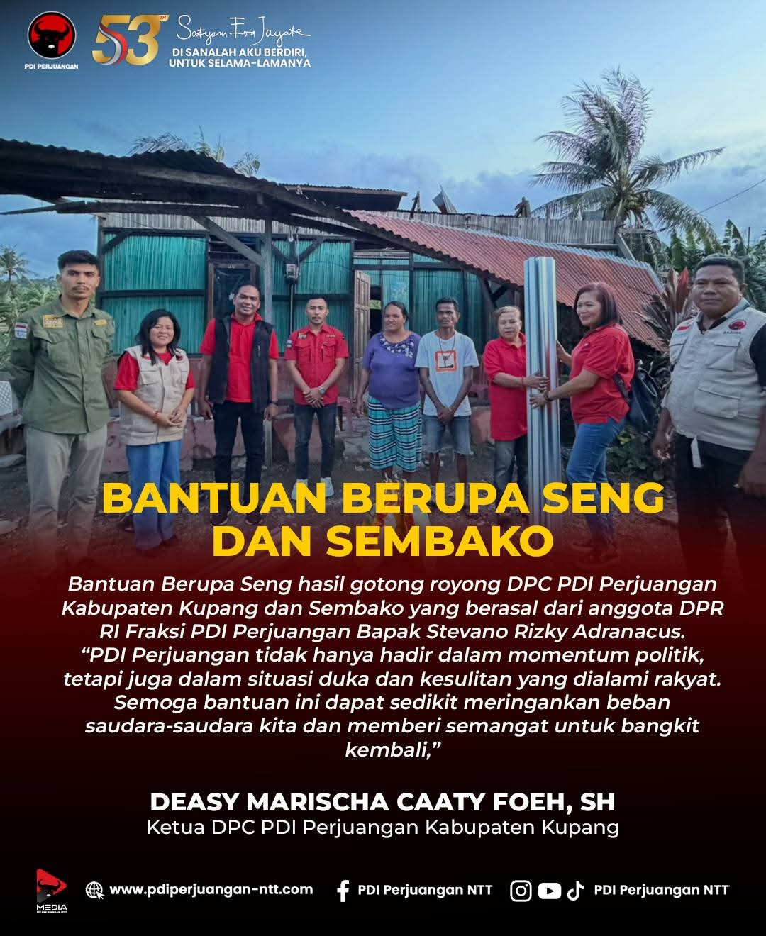 Ketua DPC PDI Perjuangan Kabupaten Kupang, Deasy Marischa Caaty Foeh, menegaskan bahwa kehadiran partai di tengah masyarakat bukan hanya dalam momentum politik, tetapi juga saat rakyat menghadapi musibah.