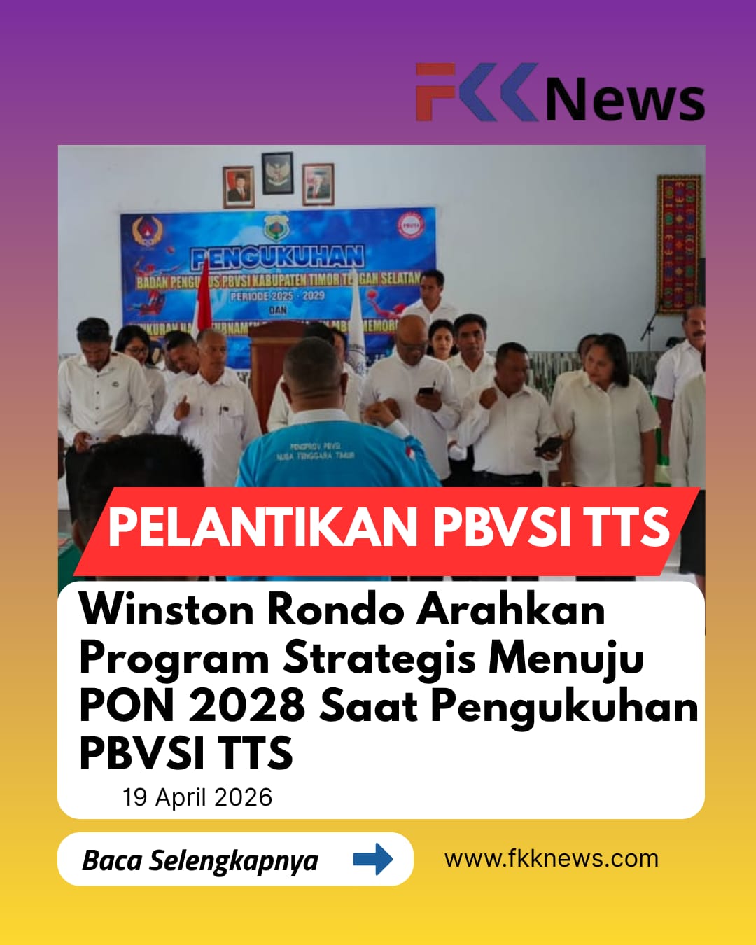 Soe, FKKNews.com – Suasana penuh semangat dan optimisme mewarnai pengukuhan Pengurus Kabupaten (Pengkab) PBVSI Timor Tengah Selatan (TTS) masa bakti 2025–2029 yang berlangsung di Aula SMK Negeri 2 TTS, Sabtu (18/4/2026). Momentum ini tidak sekadar seremoni organisasi, tetapi menjadi penegasan arah baru pembinaan voli TTS menuju panggung nasional.