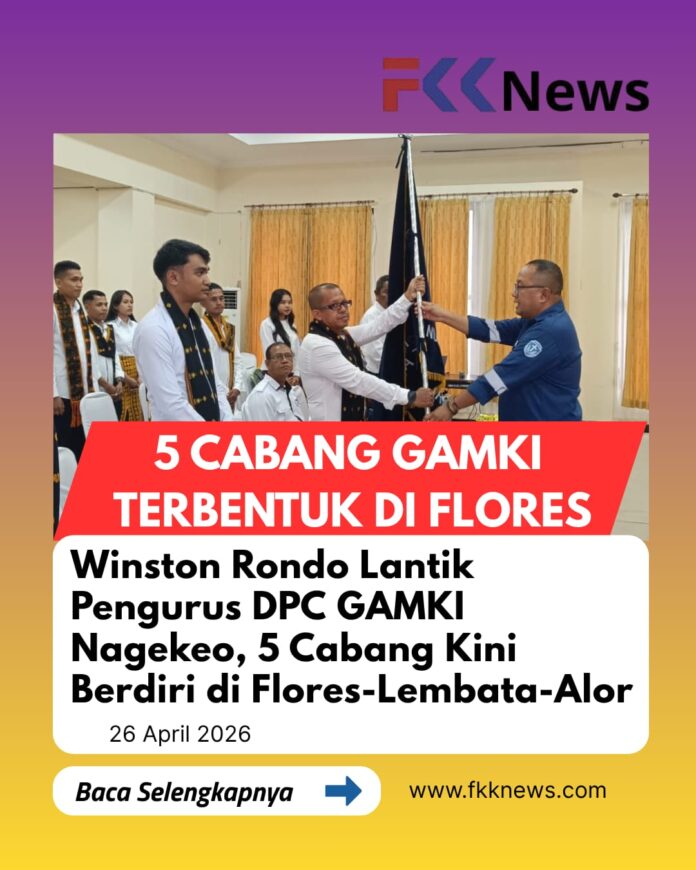 Mbay, FKKNews.com – Ketua DPD GAMKI NTT, Winston Neil Rondo, resmi melantik Dewan Pimpinan Cabang (DPC) GAMKI Kabupaten Nagekeo periode 2026–2029, Sabtu (25/4/2026) di Mbay. Pelantikan ini menandai penguatan struktur organisasi di wilayah daratan Flores–Lembata–Alor, di mana kini telah terbentuk 5 cabang aktif dari target 10 cabang.
